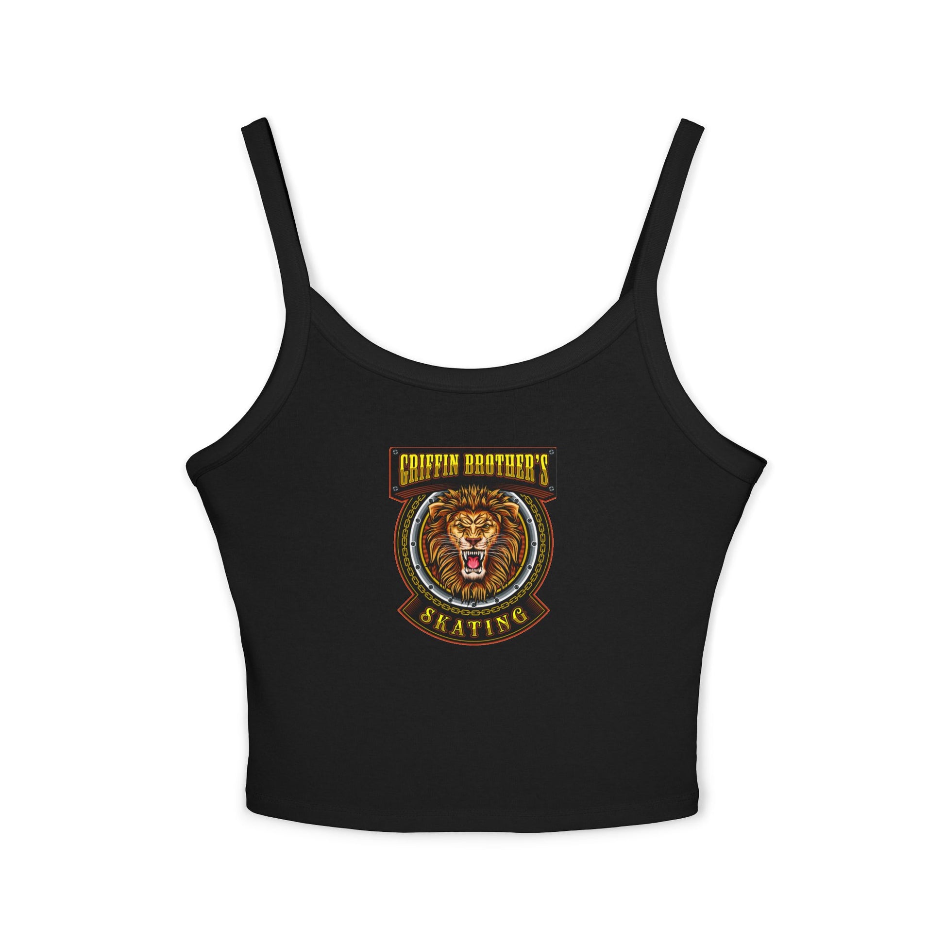 A fitted spaghetti-strap tank with a bold, vintage-inspired skating patch graphic that channels gritty rink energy and streetwise style. The mid-length cut and thicker straps keep the silhouette confident and wearable—layer it under an oversized flannel, pair it with high-waisted denim, or wear it solo on sunlit days at the skate park. The soft Airlume combed ring-spun cotton blend feels smooth against skin and holds print detail beautifully, so the roaring lion emblem stays vibrant ride after ride. Made in a socially responsible facility and printed with DTF for lasting color, this top brings an unapologetic, athletic edge to everyday looks.