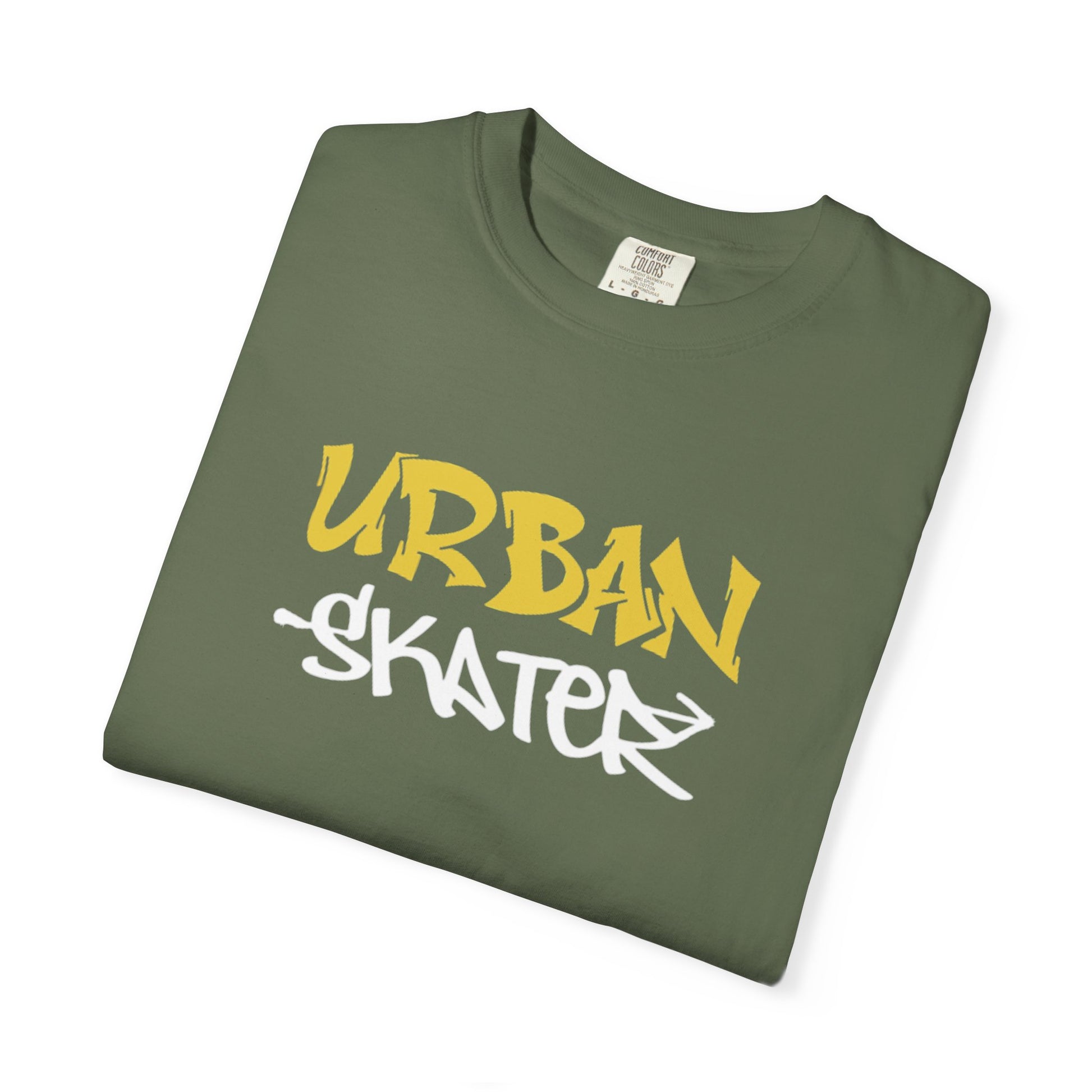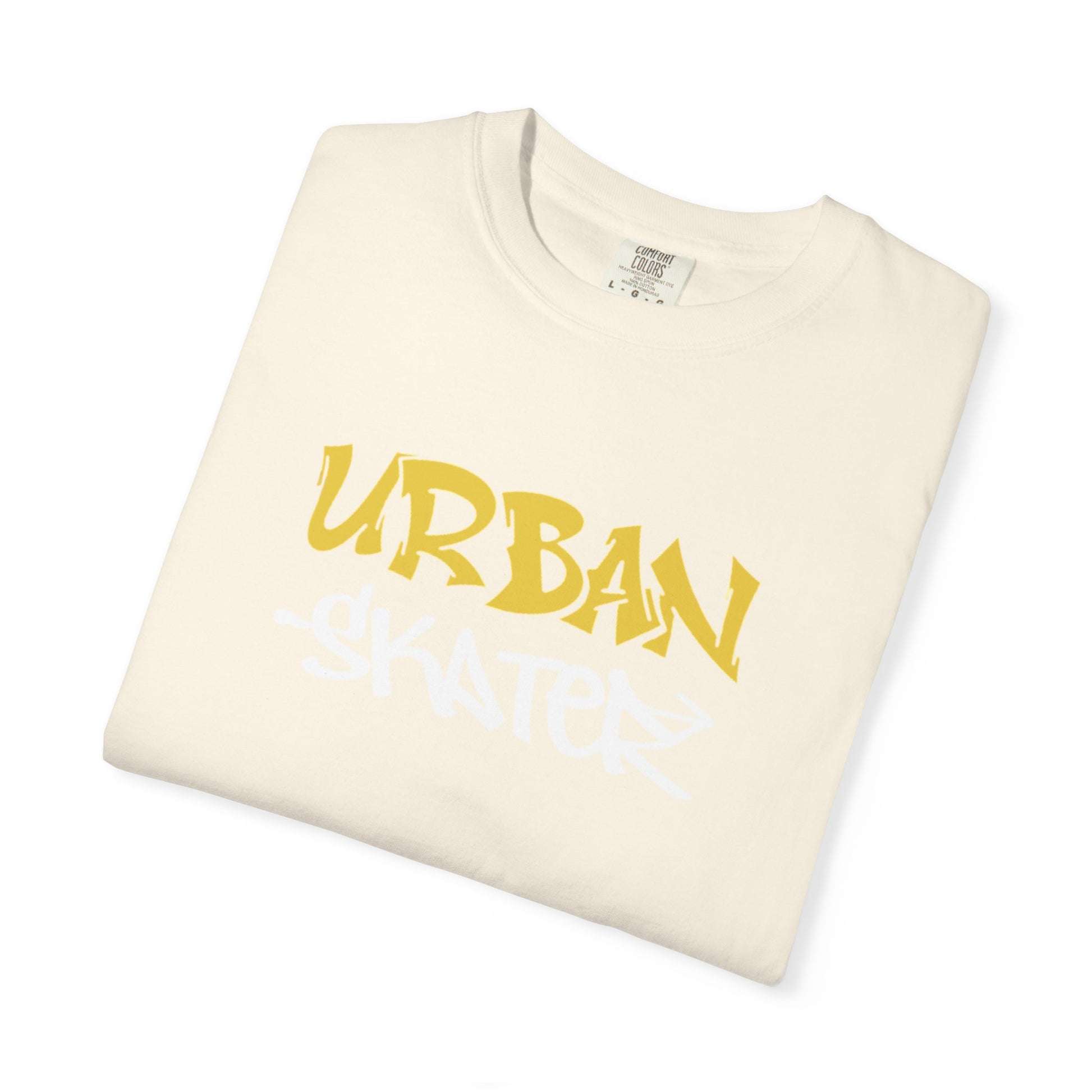A relaxed, garment-dyed tee stamped with bold graffiti energy. The front features a stark black rectangle with hand-lettered “URBAN” in sunlit gold and “SKATER” in gritty white — a streetwise contrast that reads like a tag slapped on a concrete wall. Lightweight but substantial, the ring-spun cotton softens with wear and keeps its shape thanks to double-needle seams and a tubular, side-seam–free knit. It sits casual and loose over jeans or layered under a flannel, the kind of shirt you reach for before heading out to the spot at dusk. Made to age with you, the dye and fabric mellow into a lived-in feel that complements scuffed decks and late-night sessions.